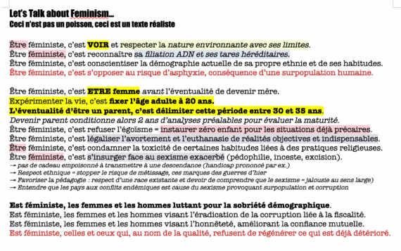 Ceci n’est pas un poisson, ceci est un texte réaliste tentant de nuancer l’origine des premiers mouvements féministes et les reprises de l’effet de mondialisation trop souvent empreinte d’amnésie. Le sexisme a toujours tué si souvent silencieusement. La surpopulation humaine mondiale établit la preuve vivante de ce virus à éradiquer. […]