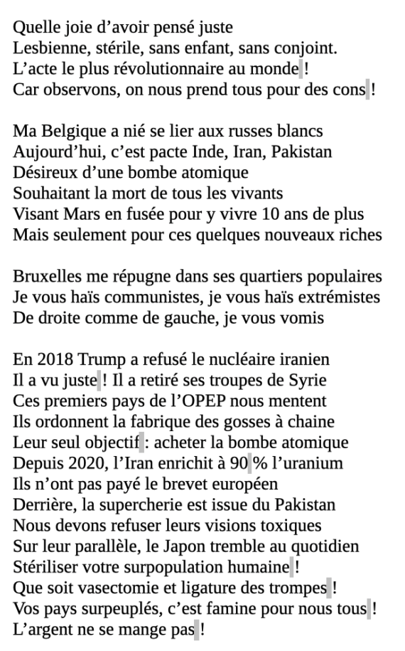 A Bruxelles, les quartiers populaires commencent à me déranger. Il est interdit de porter un voile islamique en Europe alors comment osent-il ? Je te demande Europe des 27 d’en finir avec le contrat du mariage humain pour le peuple car des étrangers utilisent cette réalité pour étendre leur misère.