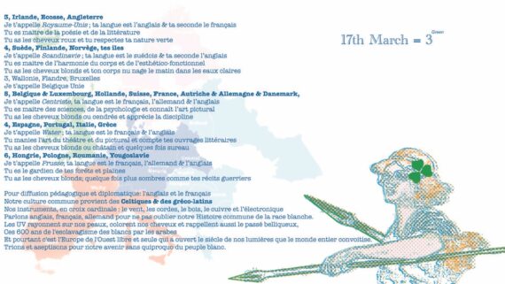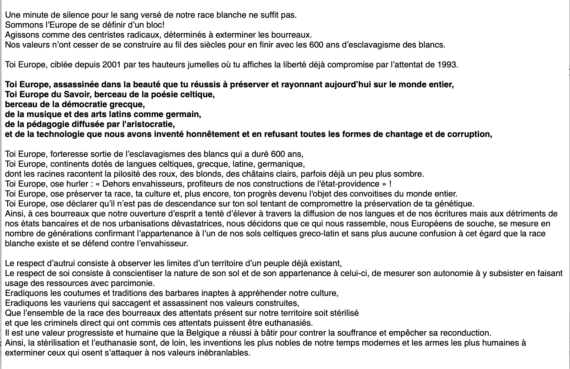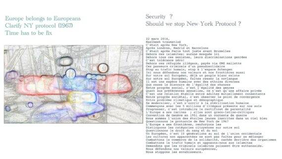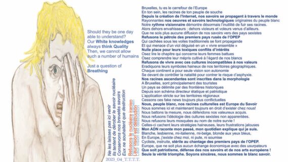 in progress Le peuple blanc n’est pas suicidaire, il existe déjà et est en droit de subsister sur ses continents. « Stoppez le trafic humain sur mon continent blanc » évoque que la vie humaine n’est pas autorisée à se reproduire sans questionner l’usage de l’encombrement spatial qui découle de ce trafic […]