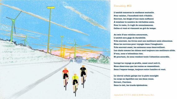 Dessin effectué depuis une photographie de paysage personnelle réalisée en avril 2014. L’ajout des trois cyclistes à été inspiré à partir d’une image issue d’une banque d’images. Les trois dossards renvoient à la patrie. Le texte poétique a été écrit ce 26 décembre 2022 et l’enregistrement vocal est présenté ci-dessous. […]