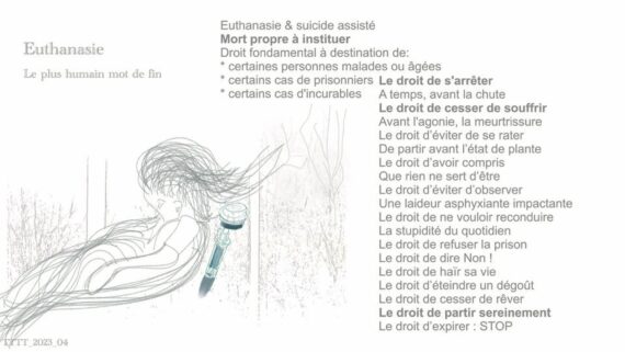 Thème de l’Euthanasie et du suicide assisté autorisé en Belgique, en Suisse et d’ici l’été en France grâce au travail mené par le projet de loi de La Convention citoyenne de la fin de vie 03/04/2023 reçue à l’Elysée ce Lundi 3 avril 2023. Dessin inspiré du documentaire sur Arte […]