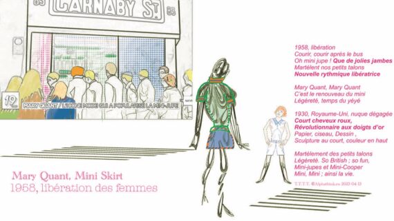 En hommage à Mary Quant. La britannique révolutionnaire de la mode. Mini-jupe pour nos jolies jambes. Mary Quant (11/02/1930 – 13/04/2023), « l’icône qui a popularisé la mini-jupe ». Partie gauche, dessin sur une capture d’écran du JT de la RTBF de 19h30 du 13/04/2023. Dessin à droite réalisé d’après des photographies […]