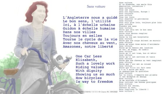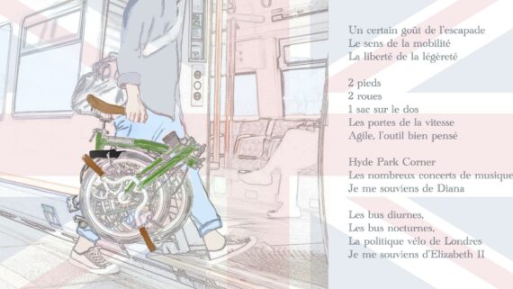 Photographie traitée provenant du site Internet de Brompton représentant la reine Elizabeth à bicyclette. Poème pour inviter l’Europe à placer vos pieds sur les pédales et à tourner dans le vent. Au coeur de la capitale de l’Europe, BIKE FOR BRUSSELS !